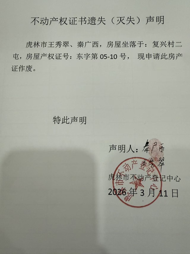 不动产权证书遗失声明-秦广西 王秀翠