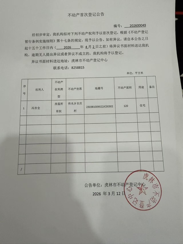 不动产首次登记公告-冯吉全
