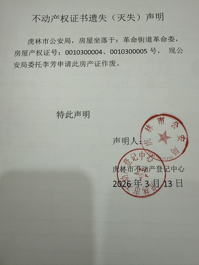 不动产权证书遗失声明-虎林市公安局
