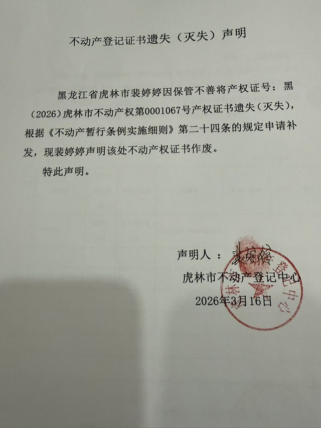 不动产登记证书遗失声明-裴婷婷