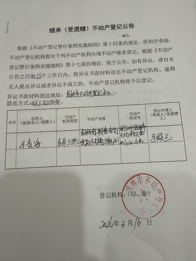 继承不动产登记公告-马殿玉