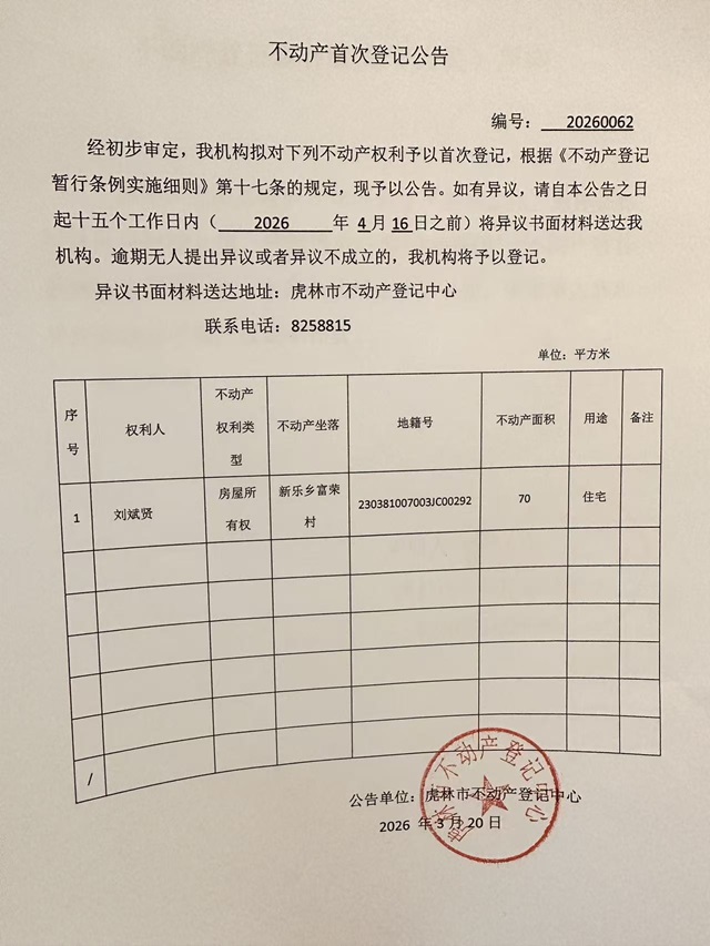 不动产首次登记公告-刘斌贤