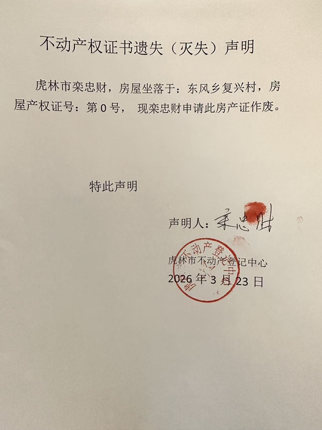 不动产权证书遗失声明-栾忠财