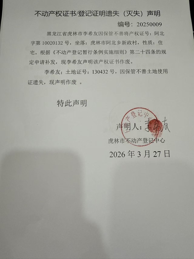 不动产权证书/登记证明遗失声明-李希友
