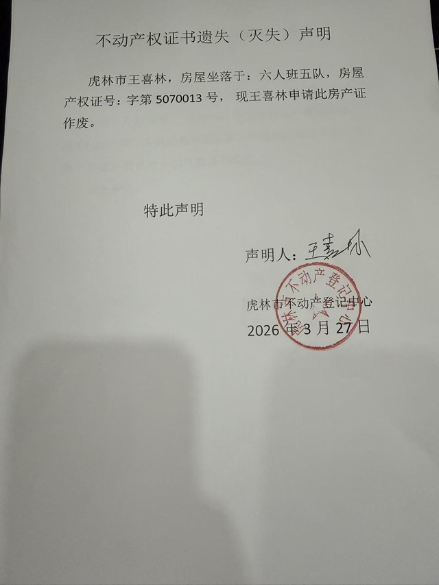 不动产权证书遗失声明-王喜林