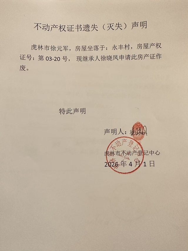 不动产权证书遗失声明-徐元军