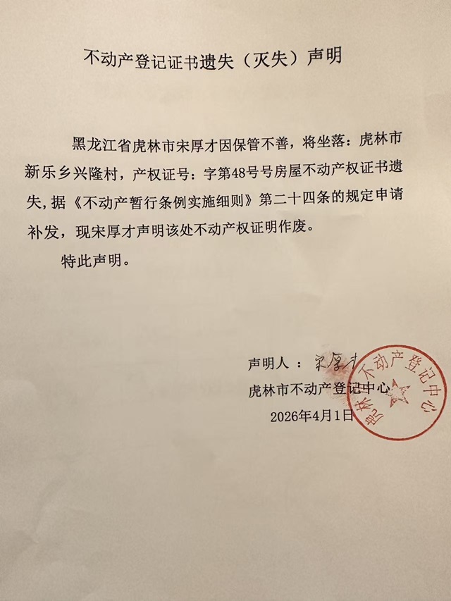 不动产权证书遗失声明-宋厚才