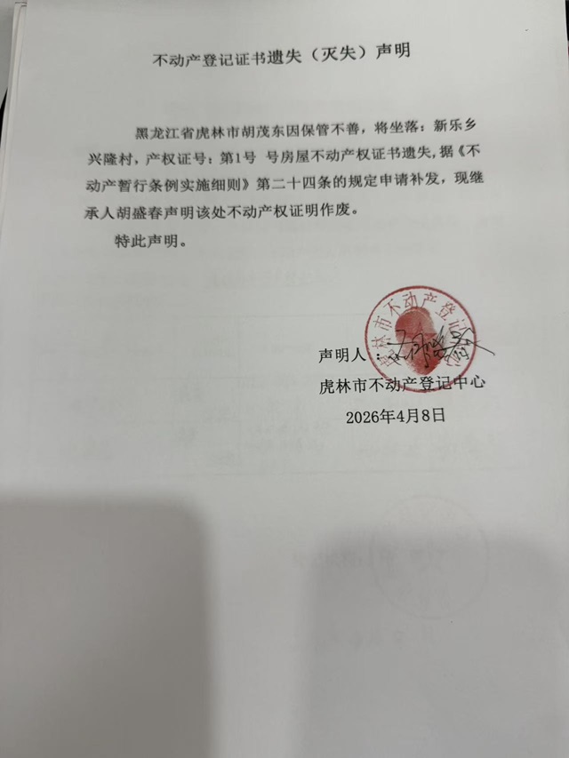 不动产登记证明遗失声明-胡茂东