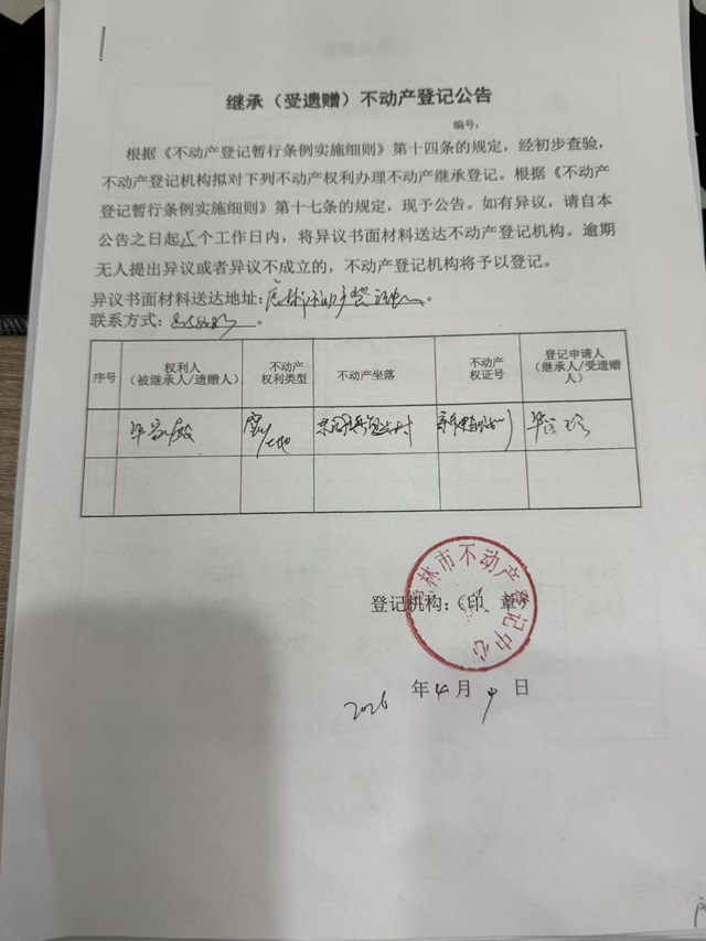 继承不动产登记公告-毕远珍