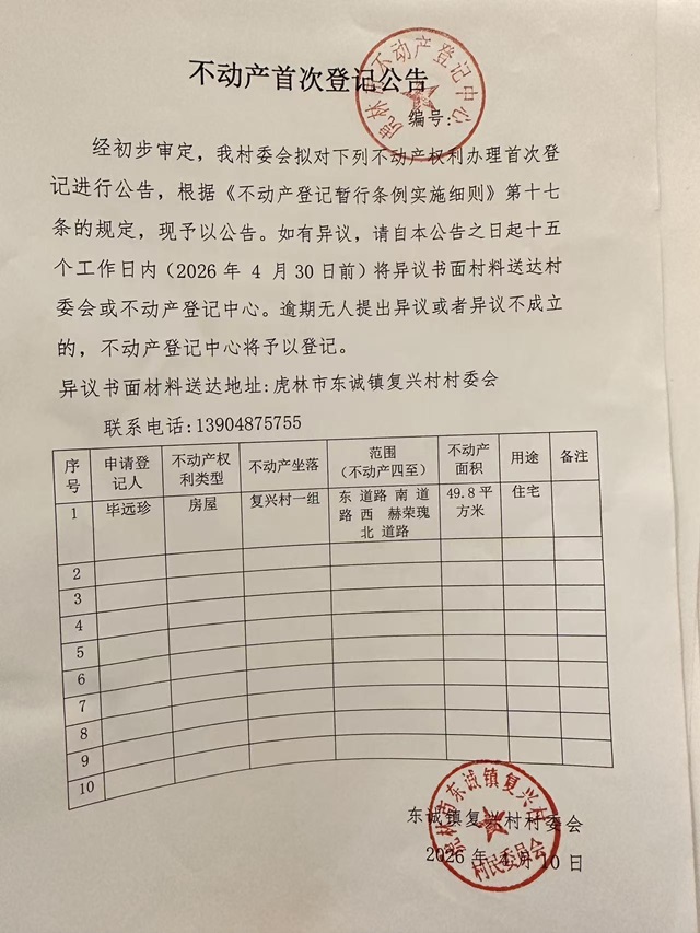 不动产首次登记公告-东诚镇复兴村村委会