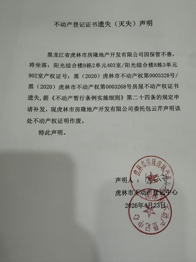 不动产登记证书遗失声明-虎林市房隆地产开发有限公司